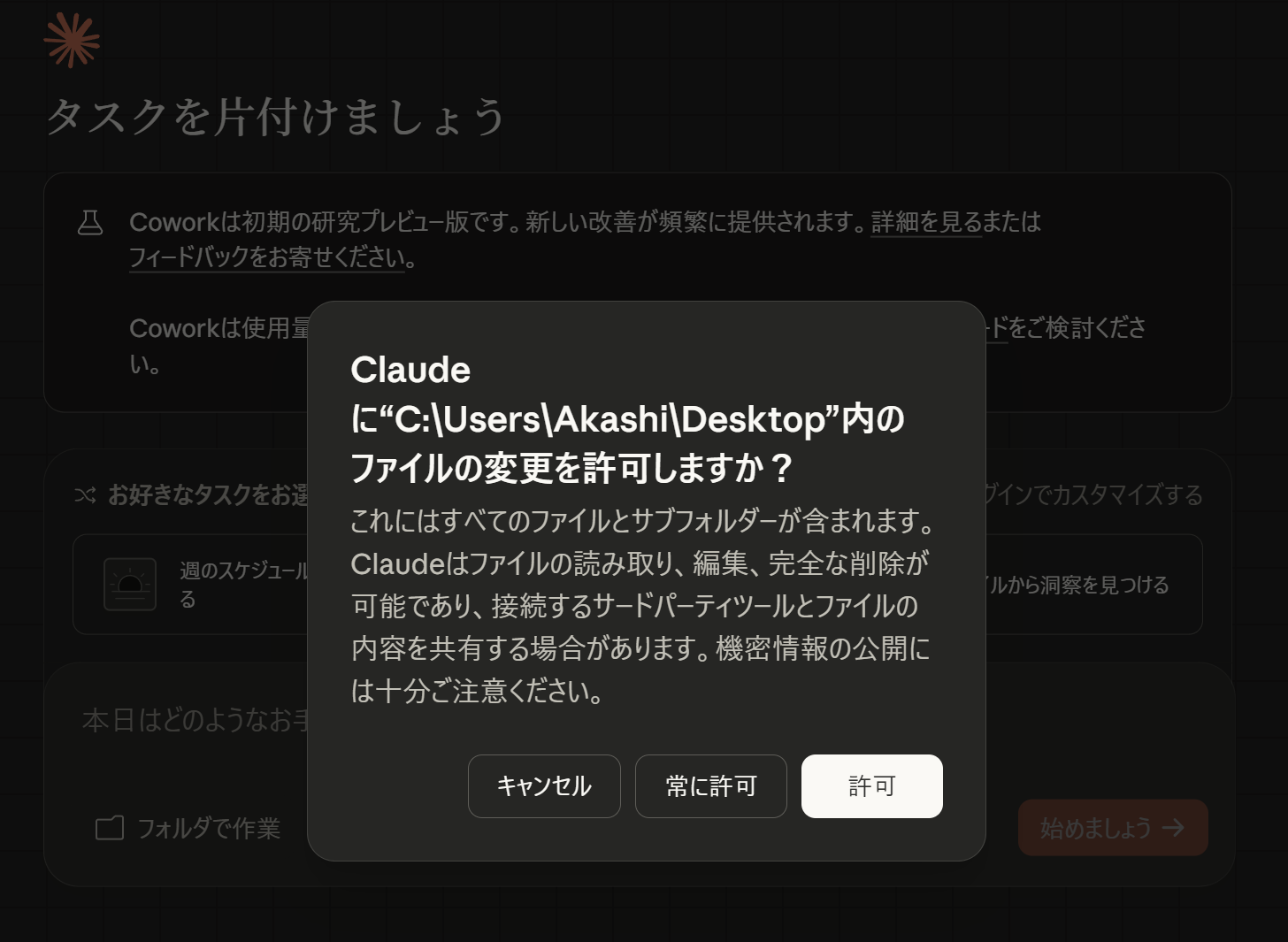 リサーチプレビューなので、まだ安定しない場面もありそうです。また、画面にも表示されていましたが、Opus 4.6は使用制限の消費が早いため、長い作業には別モデルとの使い分けが必要になります。フォルダへのアクセスを許可する仕組みなので、重要なファイルがある場所では作業用フォルダを指定するのが無難です。