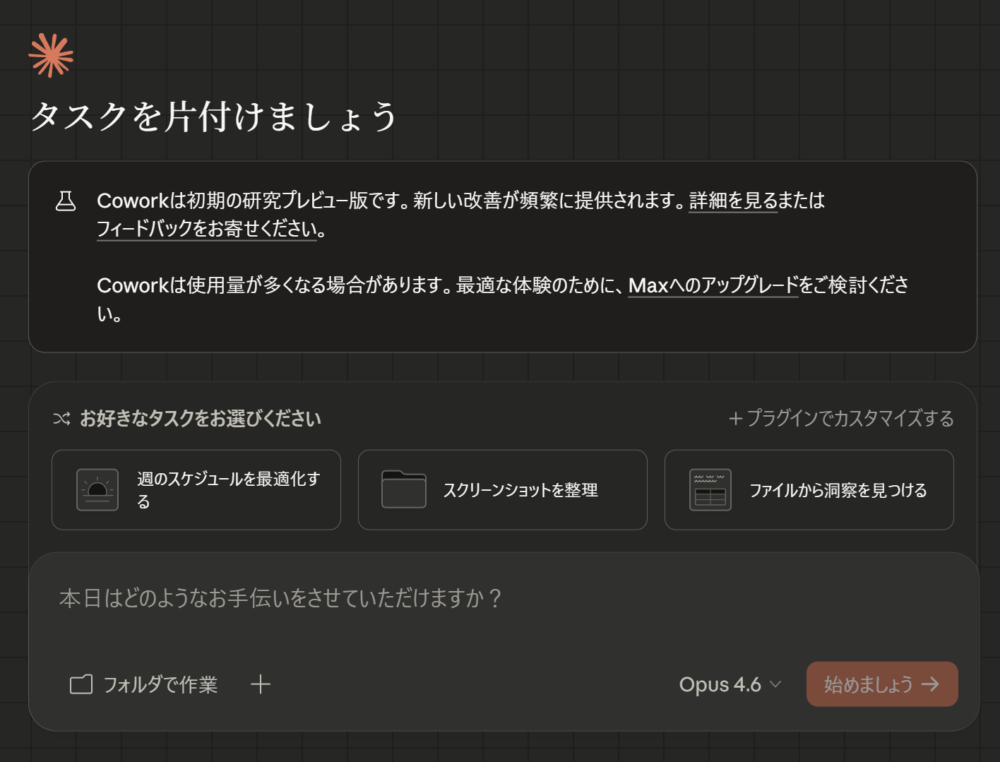 「週のスケジュールを最適化する」「スクリーンショットを整理」といったタスクの提案カードが並んでおり、下部にモデル選択(今回はOpus 4.6)とフォルダ選択のUIがあります。
